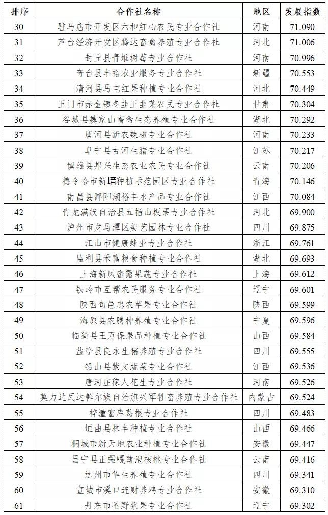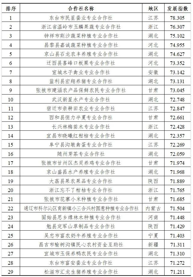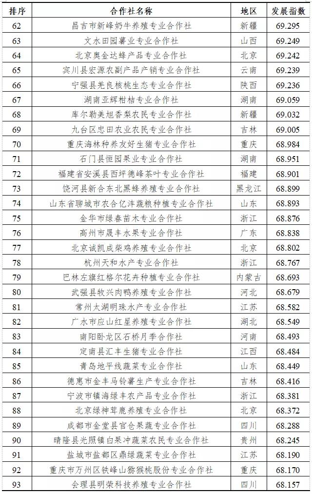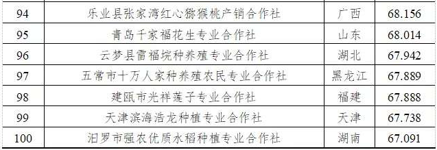 根据发展指标体系,得出了国家农民合作社示范社发展指数百强榜,具体如表3所示。